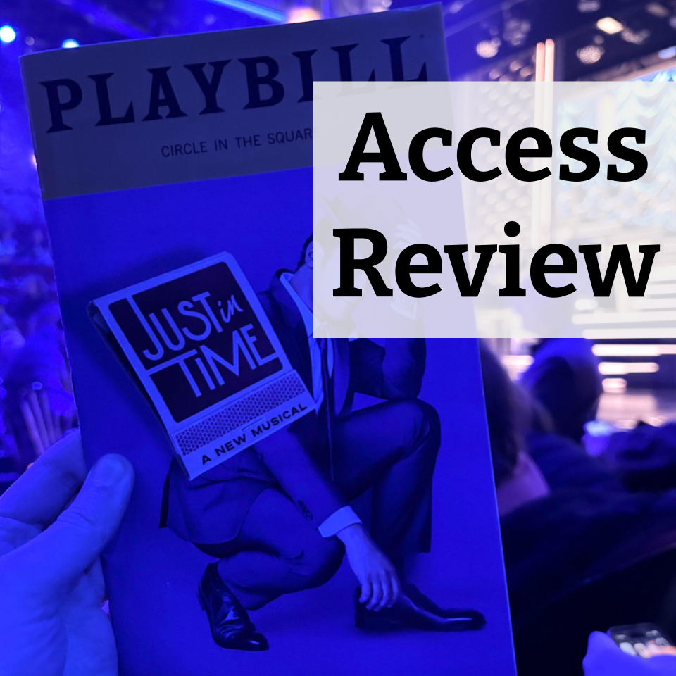 ID: image of the Just In Time Playbill in front of the stage with the text “Access Review” on top