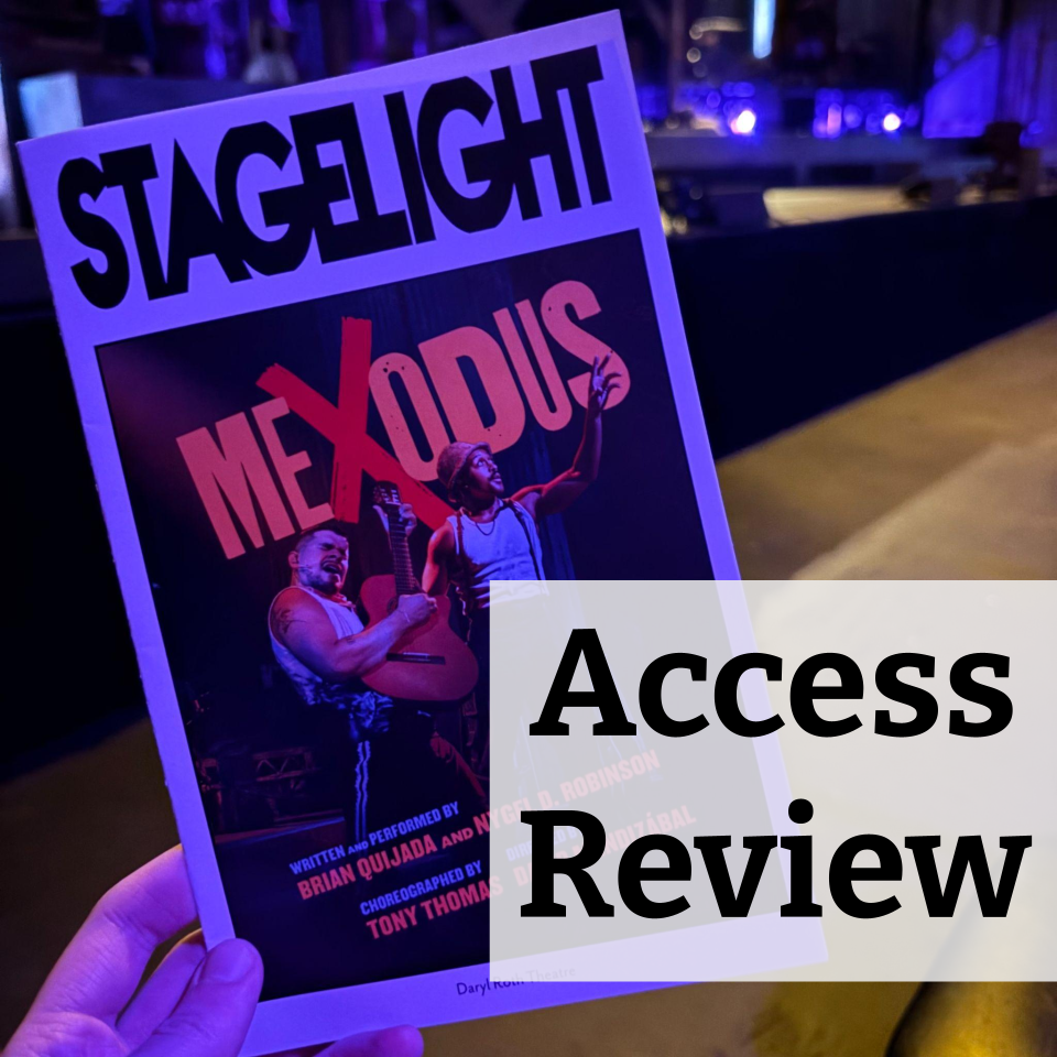 Image of the Mexodus Playbill in front of the stage at the Daryl Roth Theatre with the text “Access Review” on top