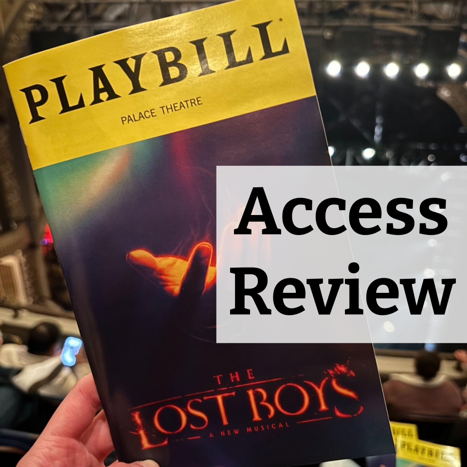 ID: image of the Lost Boys Playbill in front of the stage with the text "Access Review" on top